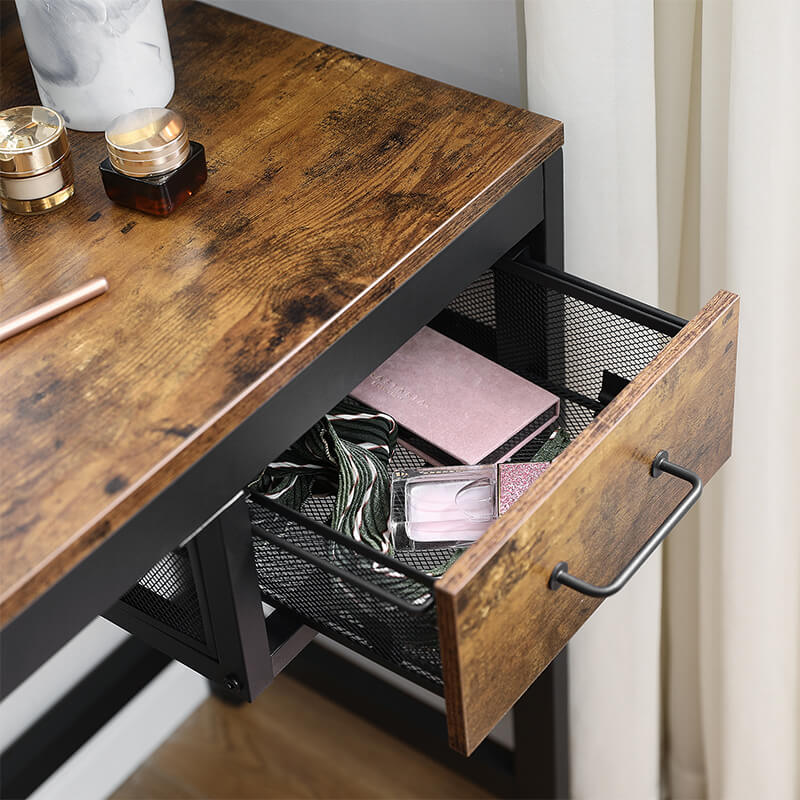 Creating a romantic vibe in your room, this industrial style vanity table set with a rustic brown surface and black metal frame sets up the perfect dressing space to help you to start your day with style.