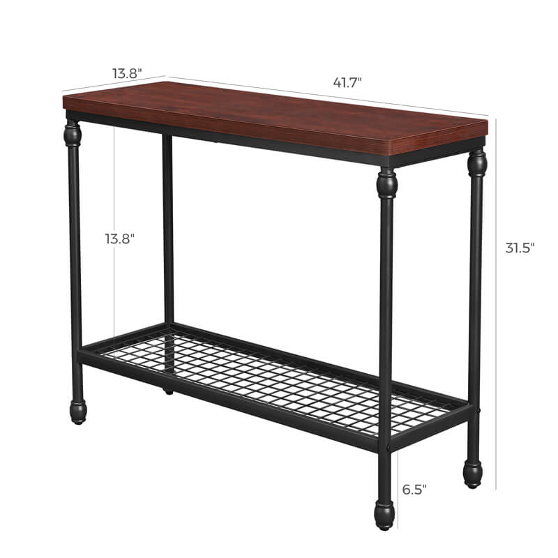 Use the open shelf up top to display any of your cherished decorations, while the metal mesh shelf storage below is ideal for anything that is tall or wide This large console table features a unique cherry-colored tabletop and column-like metal legs for a complete look.
